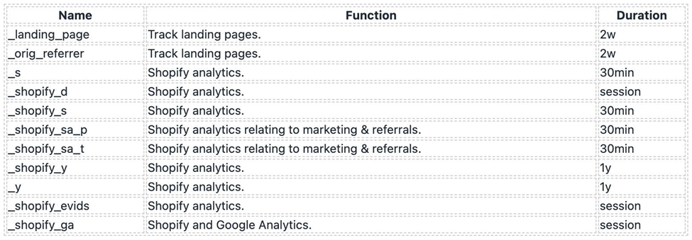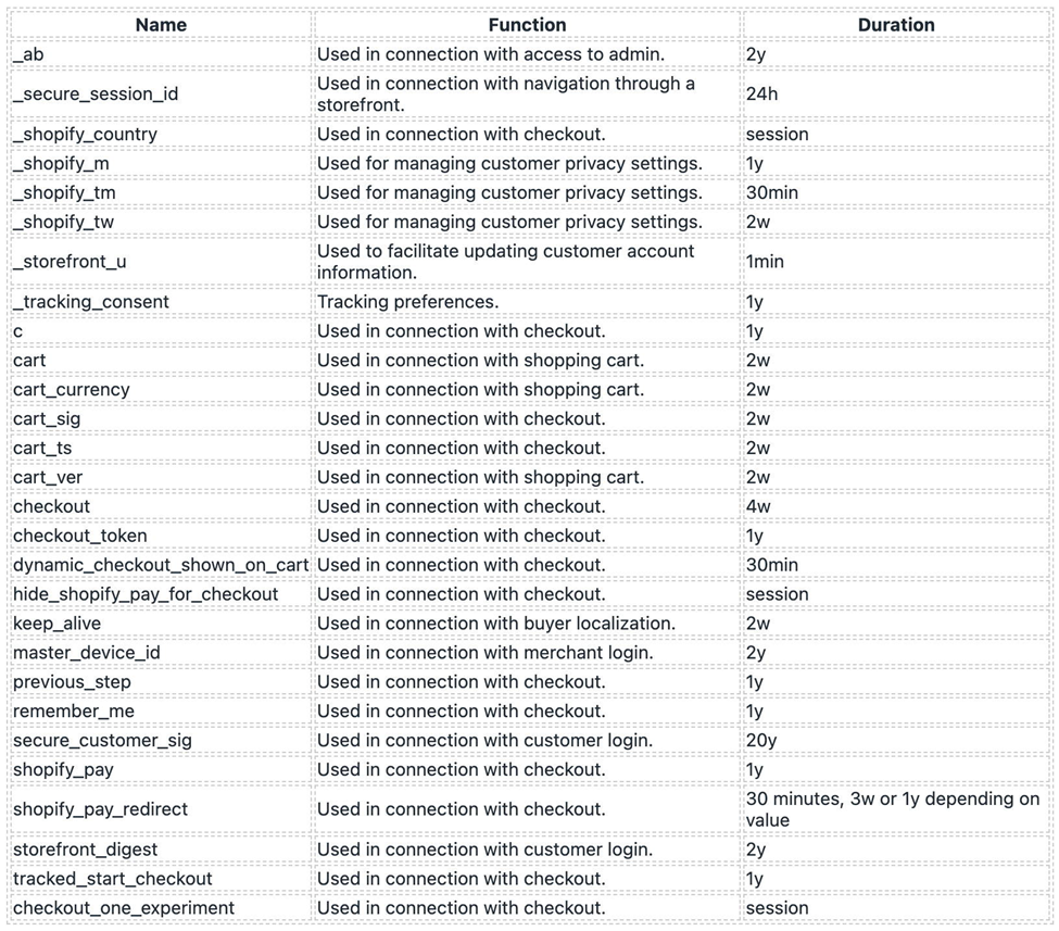 Shopify Cookie List: https://www.shopify.com/legal/cookies